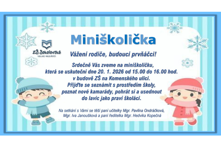8.1.2026 Srdečně zveme všechny prvňáčky, kteří se chystají k zápisu do 1. třídy pro školní rok 2026 - 2027 v naší škole