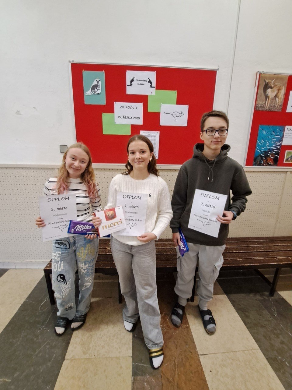 Dne 15. 10. 2025 se na naší škole konala soutěž Přírodovědný klokan. Soutěžilo celkem 31 žáků osmých a devátých ročníků v kategorii KADET. Na prvním místě se umístila Klára Pospíšilová z 9. B, druhý byl Tadeáš Žák z 9. A a třetí místo získala Nela Mejzlíková z 9. B. Všem zúčastněným děkujeme a výhercům gratulujeme.